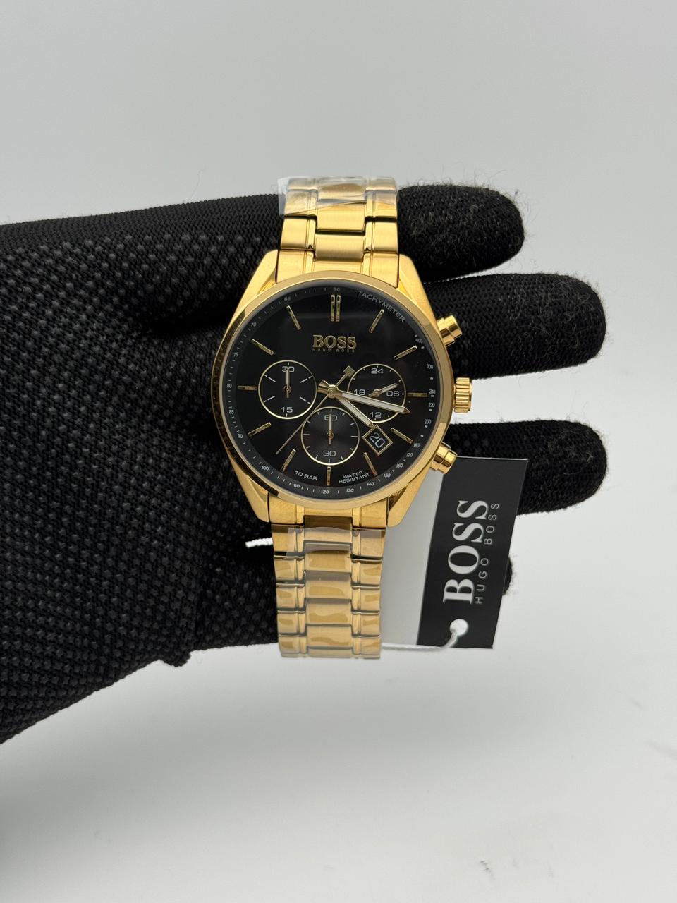 Elevate your style with the Hugo Boss Menβs Chronograph Watch, crafted for men who prefer a bold, luxurious, and confident look. Featuring a striking black dial with gold-tone detailing, this watch delivers a powerful wrist presence suitable for both formal and casual wear.